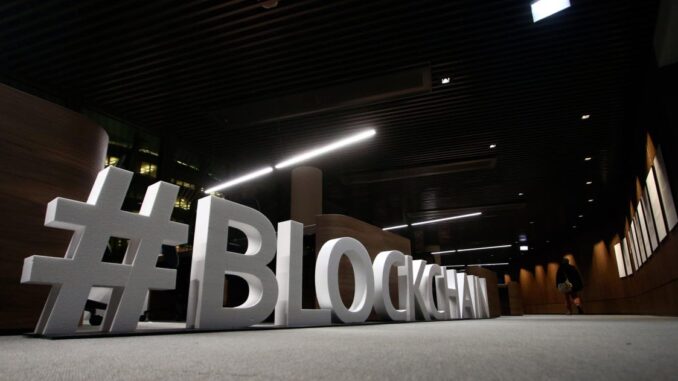 Large letters, studying the phrase “blockchain” are displayed on the blockchain centre, which goals at … [+]